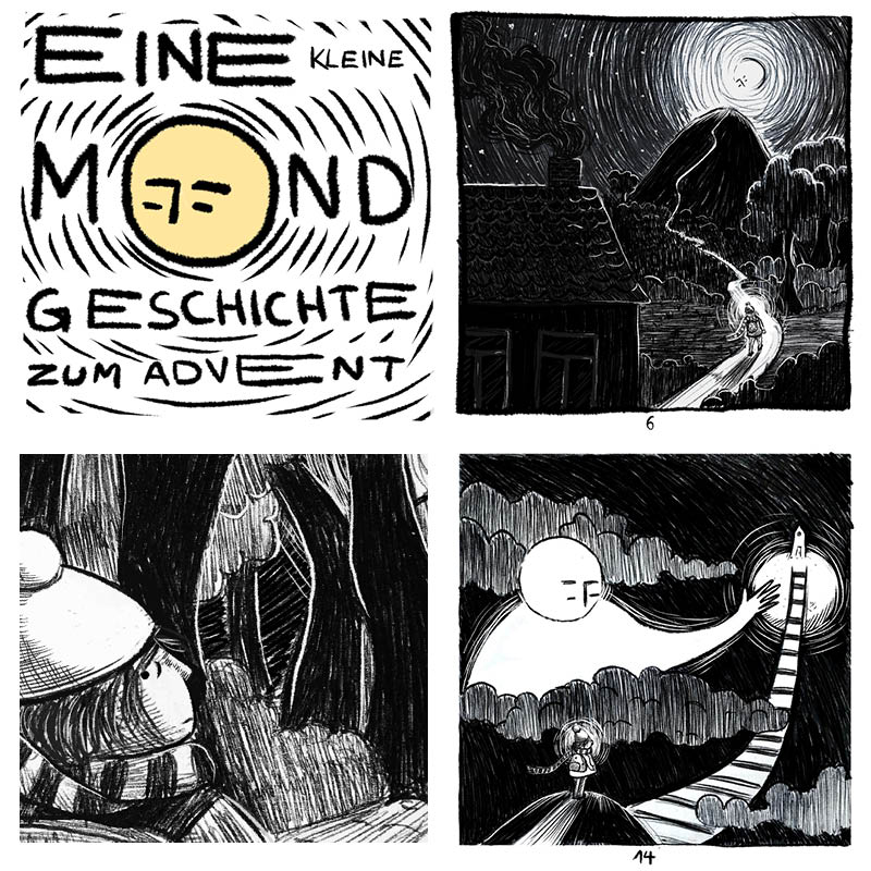 In diesem freien Illustrationsprojekt entstand eine kleine Mondgeschichte in Form eines Adventskalenders mit 24 handgezeichneten Bildern. Die Geschichte erzählt von einem kleinen Mädchen, das sich mutig auf den Weg macht, um gemeinsam mit dem Mond Bärentatzen zu backen – eine warme, fantasievolle Erzählung über Neugier, Mut und Freundschaft.